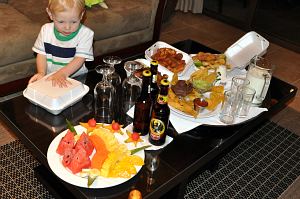 Our hotel had a restaurant serving three meals a day, but we would be arriving too late to place a dinner order. When I asked, the hotel was happy to arrange to have our requests kept warm to greet us upon arrival. Though we would have dinner on the flight, it would still be some hours until we reached our destination, and there were no guarantees how much the children would eat during our travels—or when. With a plate of fresh fruit and their assorted plate of chips, guacamole, chicken fingers, chicharrones, and fish, I not only knew that we wouldn’t go to bed hungry but that our arrival after the long day of travel would feel all the more festive.
