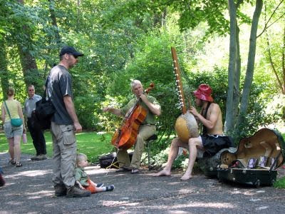 It’s not every day that I stumble upon someone wearing the lower half of a French maid’s uniform and toting one of these puppies barefoot through a park (even in San Francisco). Naturally, I had to stop and ask him about his large instrument.